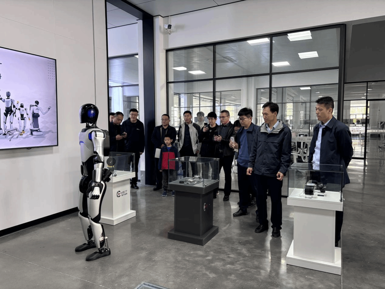随后,企业展示了“具身智能”的当前研究成果——两台高灵活性智能机器人。企业最新研发的双足人形机器人不仅实现了平稳行走,还能完成舞蹈等精细化动作,其关节灵活度与动态平衡能力远超预期。另一台人形机器人则承担了展厅引导与讲解任务,全程带领考察团依次参观各功能区域,并针对产品性能与技术参数进行了详细解说。